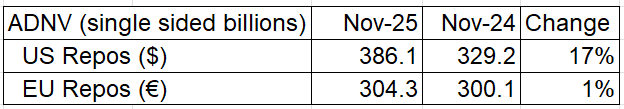 BrokerTec reported figures showing US repo average daily notional value (ADNV) in November was up 17% year-on-year (y/y) at $386.1 billion, down from October’s $391.8 billion. European repo ADNV was almost flat y/y at €304.3 billion, and slightly higher than October’s €299.9 billion.