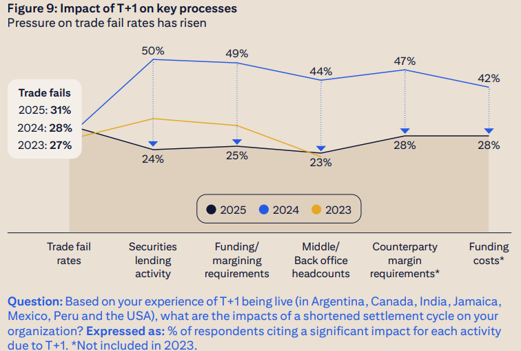 Trade fail rates alongside affirmation rates and margin reduction were the three main ‘temperature checks’ for the success of T+1 in the US. One year on from the transition, the impact of T+1 on all of these areas has significantly lightened. Funding and margining requirements have become notably less acute (with 25% significant impact in 2025 vs 49% in 2024), as have counterparty margining costs (from 47% in 2024 to 28% in 2025),