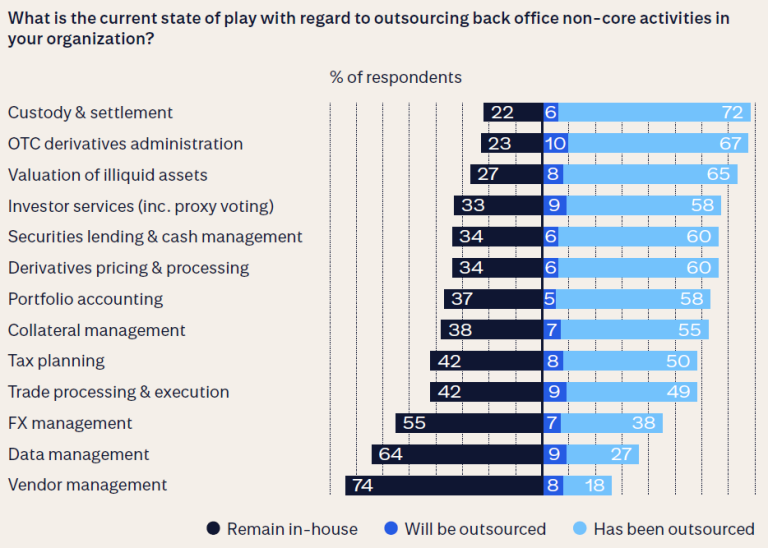 Of the 13 main back office activities, ten have been outsourced by one in every two asset managers. The top five are: custody and settlement; OTC derivatives administration; valuation of illiquid assets; investors services (incl. proxy voting); and securities lending and cash management.