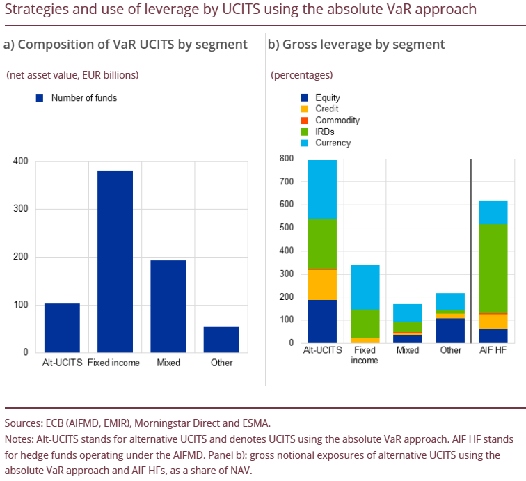 UCITS employing the absolute VaR approach constitute at least 8% of all UCITS funds in terms of net assets and pursue a variety of strategies. Some UCITS using the absolute VaR approach have high levels of gross leverage that exceed those of alternative investment fund (AIF) hedge funds. These funds constitute 2% of all UCITS in terms of net assets.