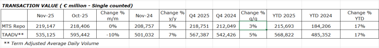Euronext MTS Repo figures showed that November repo average daily volume (ADV) was flat m/m at €219.1 billion, but up 5% y/y. Term-adjusted ADV showed a 10% drop m/m to €535.1 billion, but higher 7% y/y. Quarterly and YTD results were both 17% higher compared to the same time period in 2024.