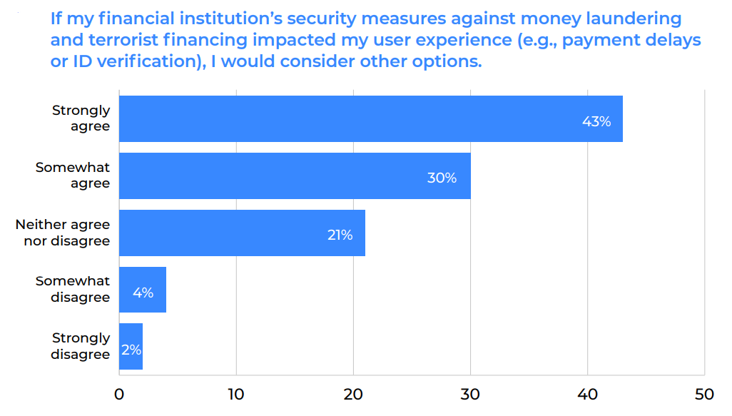 Nearly three in four respondents said they would consider switching banks if AML controls — like payment delays or intrusive checks — disrupted their experience. These numbers highlight the reputational stakes at play and the urgent need to strike the right balance between effective compliance and frictionless service.